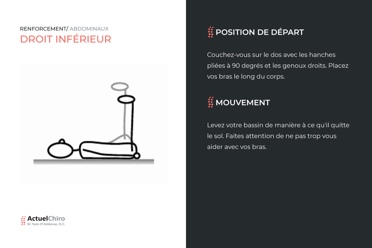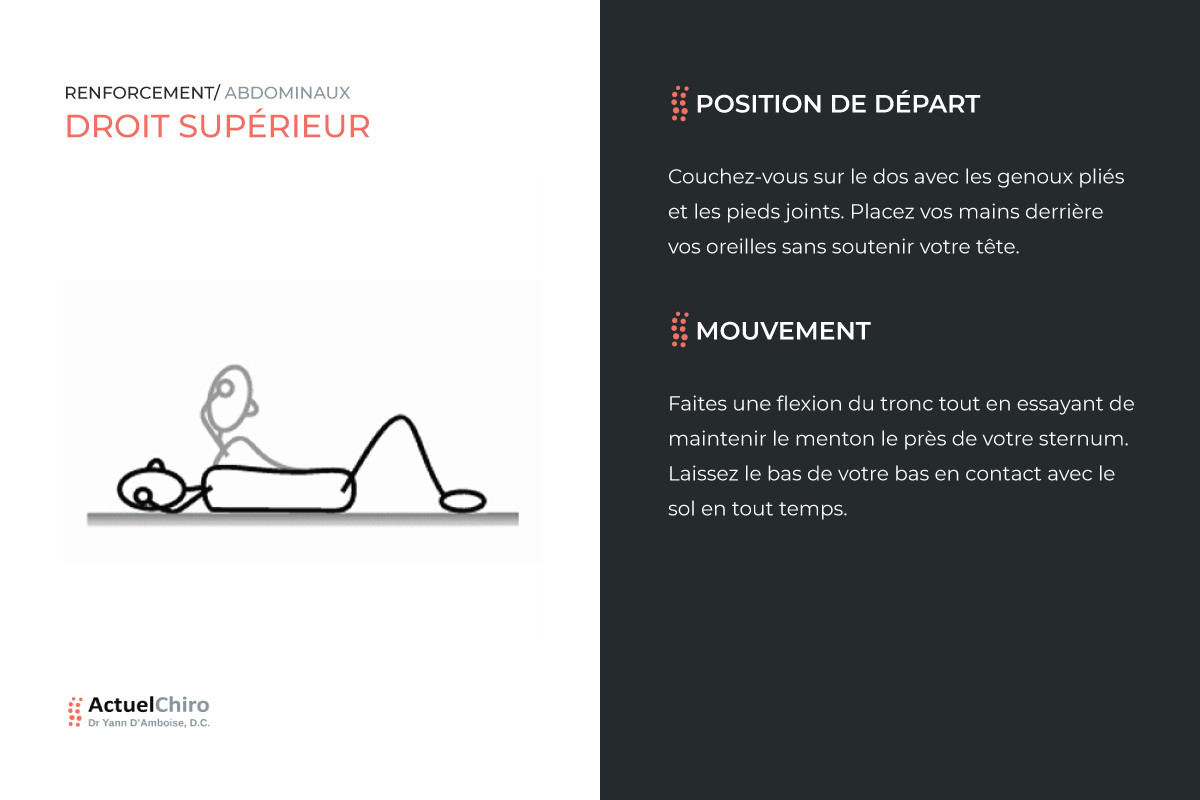 La description de chaque exercice étant abrégée, elle peut paraître insuffisante pour ceux et celles qui n'y sont pas familiarisés. Par conséquent, si vous avez des interrogations, n'hésitez pas à vous renseigner auprès de votre chiropraticien.