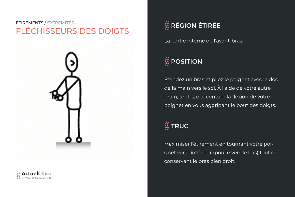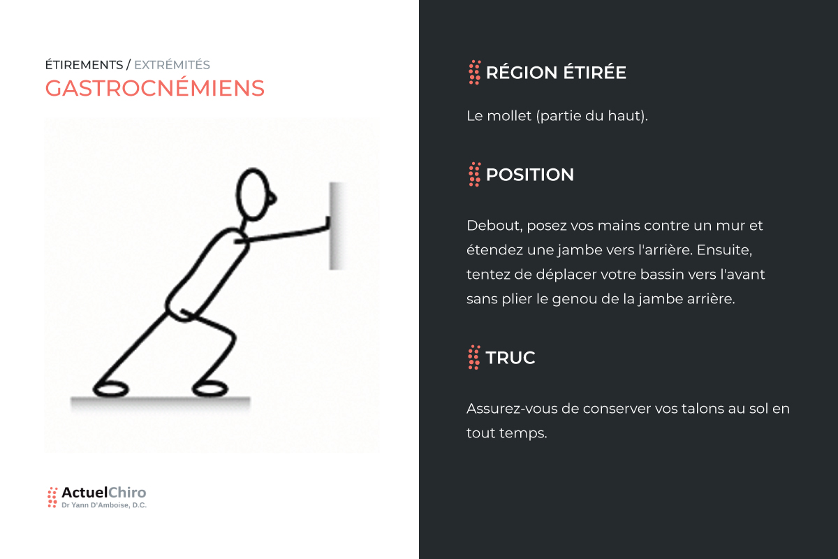 À moins d'indications contraires, chaque exercice d'étirement doit être accompli matin et soir ainsi qu'avant et après chaque séance d'activité physique. Une seule exécution de chaque côté est suffisante à condition de maintenir la position durant une période minimale de 30 à 60 secondes.